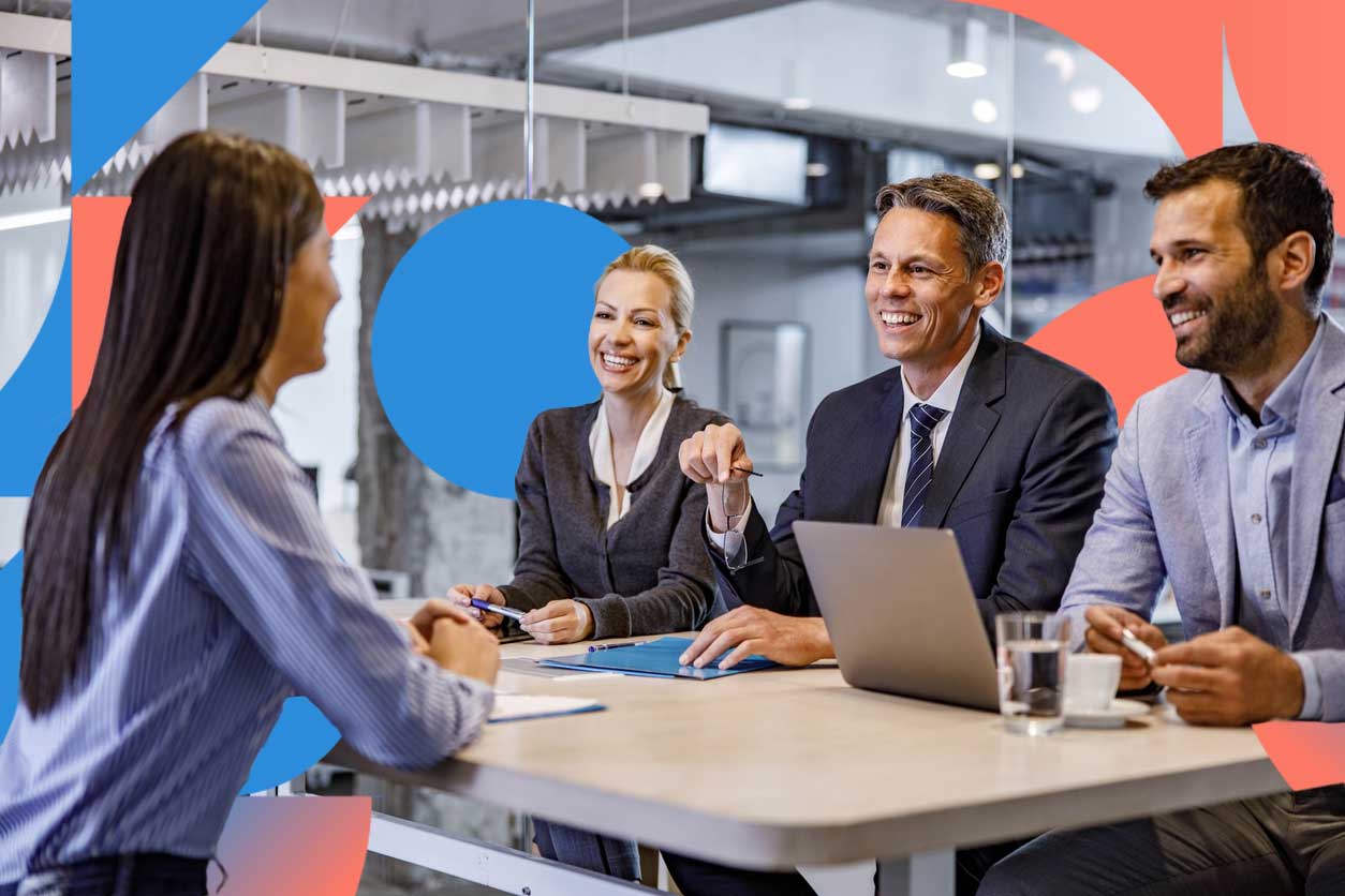 Team of professionals in a business meeting, smiling and collaborating around a table.