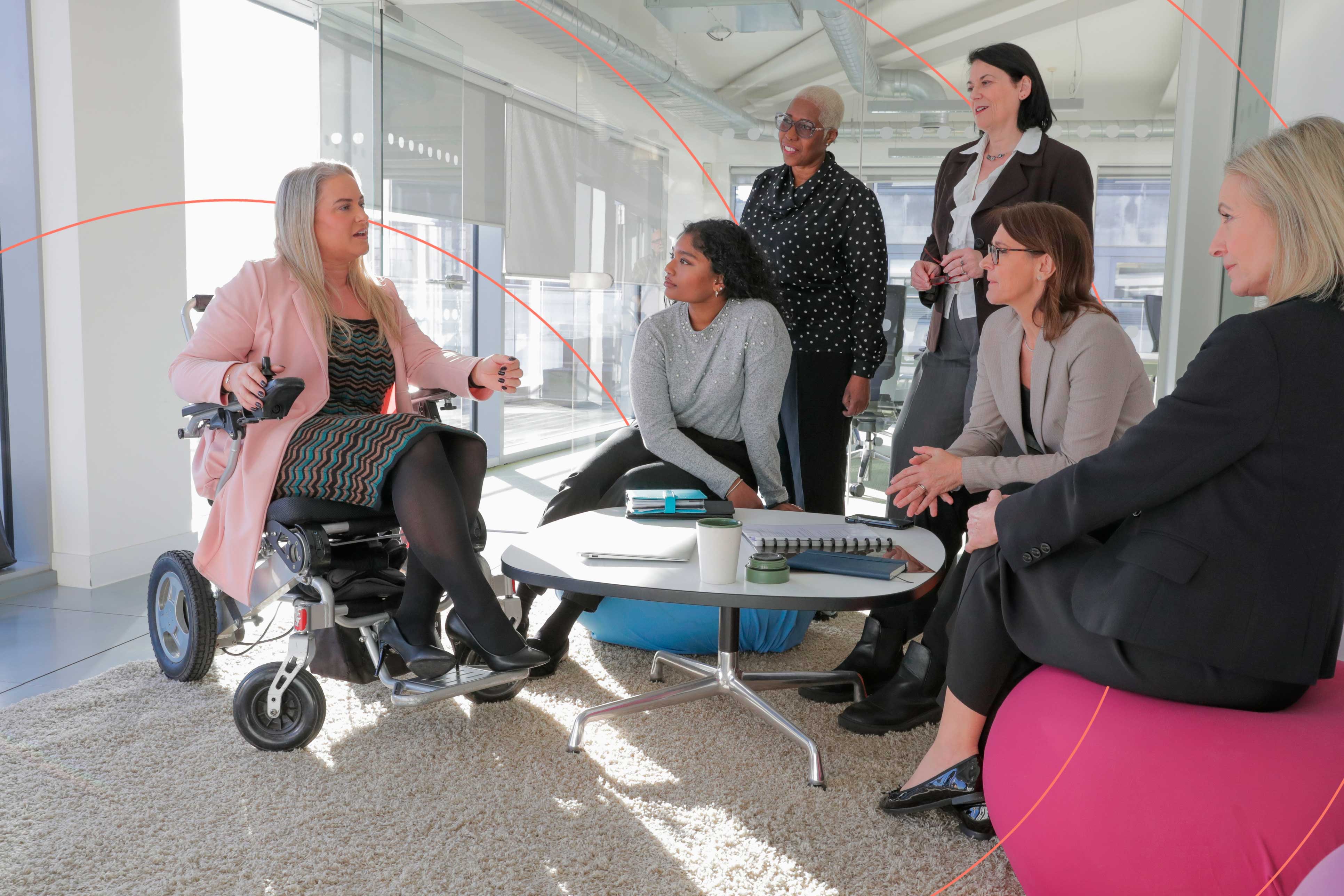Diverse group of professionals having a meeting, with one person in a wheelchair leading the discussion.