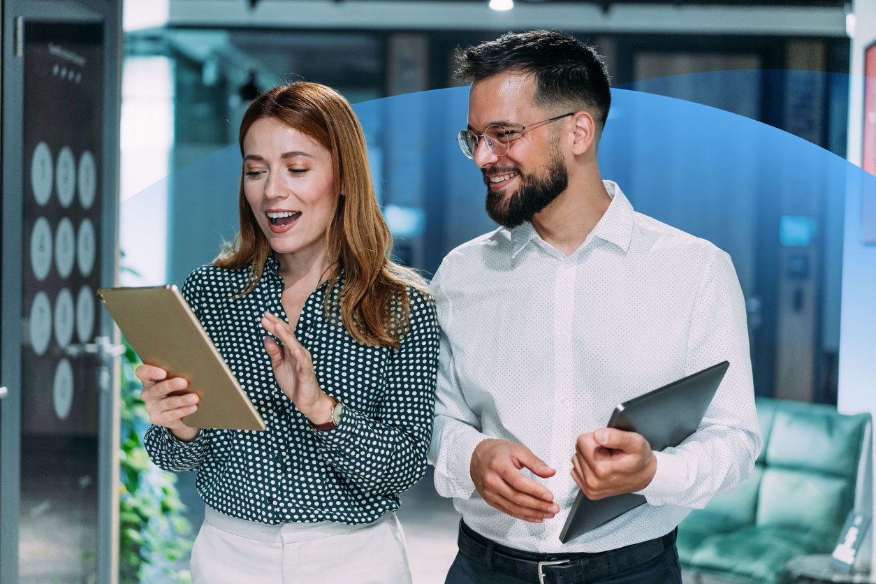 A man and a woman standing together in an office, smiling as they review content on a tablet device.